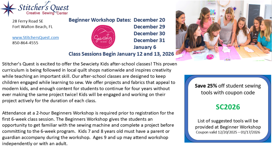 Students must attend the Beginner Workshop for an introduction to the sewing machine and to complete their first project, then they are eligible to enroll in the After-School Classes. New registrations for Sewciety Kid's Program are only available at start of each six-week session. Because of the nature of the curriculum, new registrations are not available after the term has started. Therefore, this Beginner Workshop is only offered prior to an upcoming enrollment period.